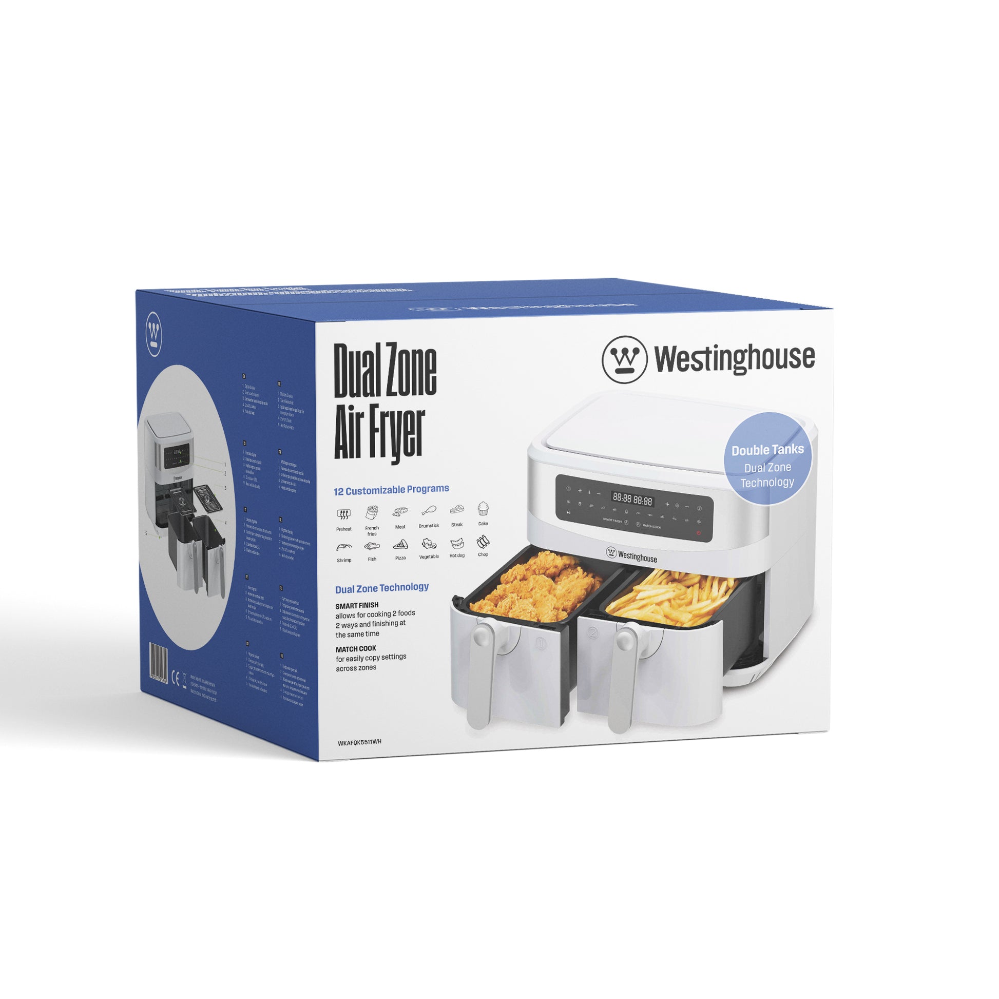 - Dual Zone Cooking: Two 4.5L (4.7qt) compartments, with a combined capacity of up to 1.8kg (4lb) of food, ideal for preparing multiple dishes at once.